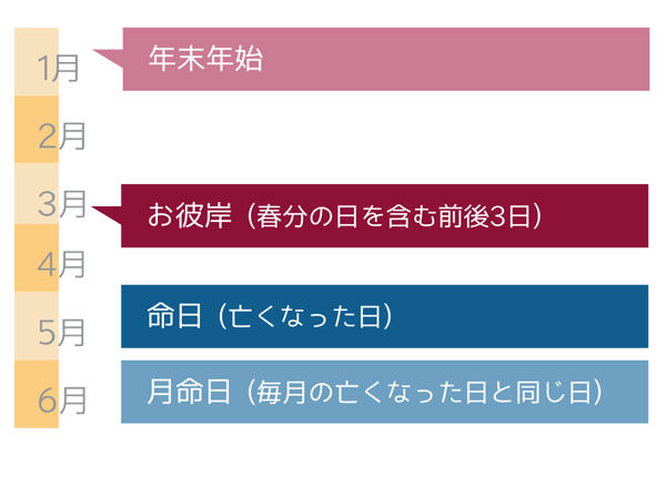 「お墓参りっていつ行けばいいの?」そんな疑問をお持ちの方のため一例をあげてみました。